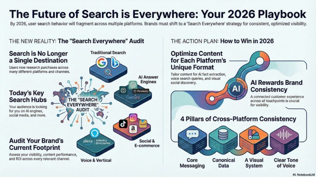 Google remains important, but it’s one destination among many. Winning in 2026 means consistent visibility wherever your audience searches.
